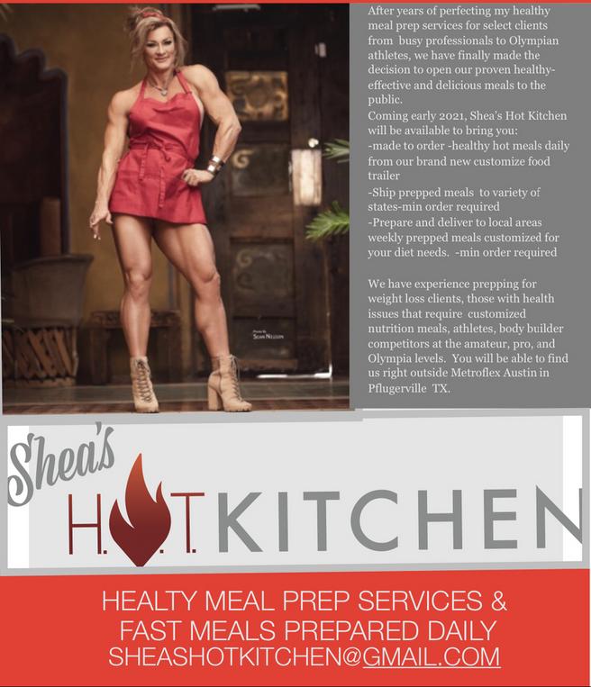 Founded by Shea Menchaca, IFBB Pro Women’s Bodybuilder and owner of Metroflex Austin, Shea’s Hot Kitchen focuses on preparing high-quality meals that support athletes, fitness clients, busy professionals, and anyone looking for convenient, healthy food options.